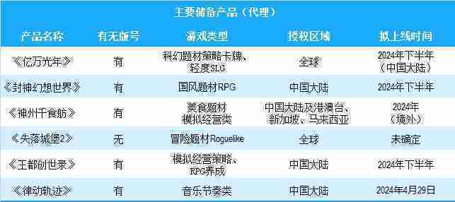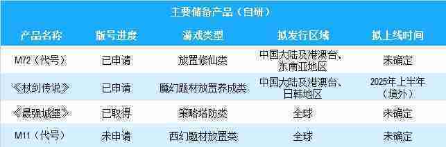公司有多款储备产品,,,,涵盖放置类、、、、策略类、、、、RPG、、、Roguelike等多元化游戏品类,,,,储备的主要自研和代理产品如下:::