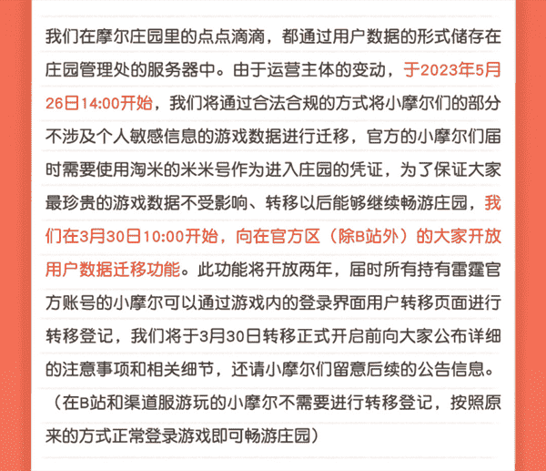 合作结束本就是开发方和代理方双方的事情,,,,降低这件事情对玩家的影响,,才是对所有珍视这段童年的摩尔玩家最好的呵护。。目前看来,,用户完全不用担心后续因无法登录游戏而造成任何数据上的损失,,,只要及时进行账号转移,,,就可以好好保留、、、、延续在庄园的痕迹和回忆,,继续在庄园里做快乐的红鼻子小鼹鼠。。。。