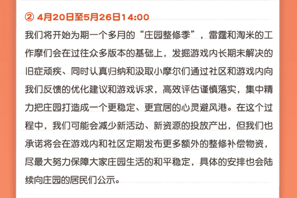 合作的结束并不意味着这个童年IP的结束,,,,对于《摩尔庄园》手游而言,,这是一个新阶段的开始。。。后续游戏内将开启庄园重构计划,,,,会就以往遗留下来的BUG进行集中修复,,并在游戏内和社区定期发布更多补偿物资。。。。