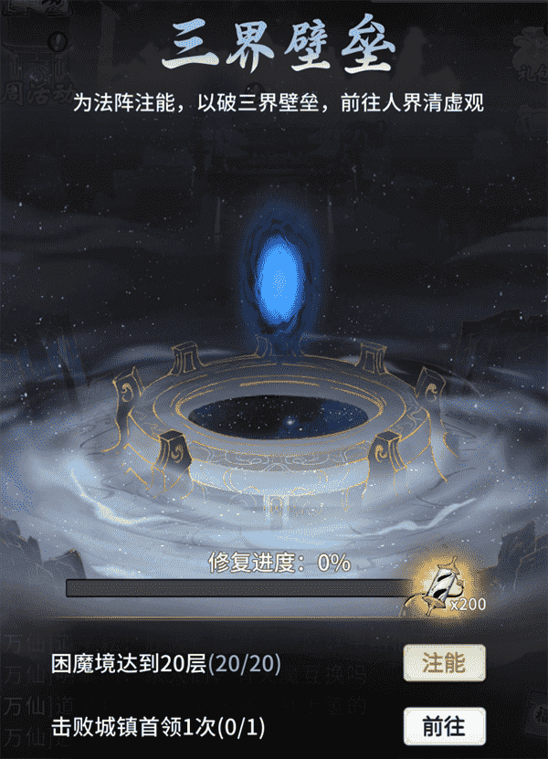 当你修为达到返虚/破虚中期后,,,可在城镇寻得芸丫并激活神秘法阵,,,通过收集材料、、、、击败首领等方式为法阵注能,,,借以打破三界壁垒,,,开启支线剧情“清虚旧梦”