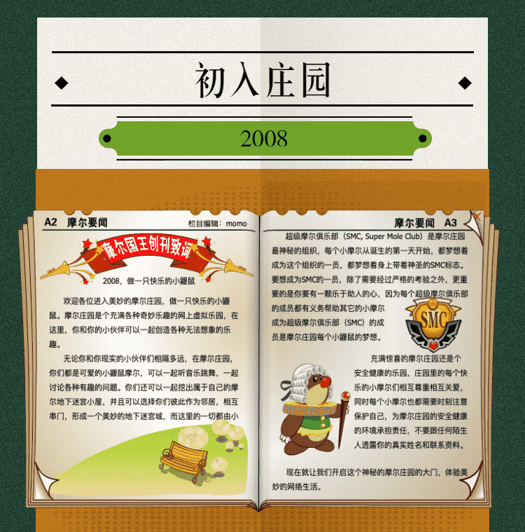 在这一年,,,,摩尔庄园诞生了。。在这里,,,大家都是可爱的红鼻子鼹鼠小摩尔,,,,可以一起勤劳耕作,,一起高山滑雪......我们都是摩尔庄园的建设者。。。